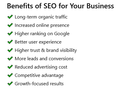 SEO (Search Engine Optimization) is the process of improving your website so it ranks higher on search engines for relevant keywords. When your site appears on the first page of Google, your chances of getting clicks, leads, and sales increase dramatically.